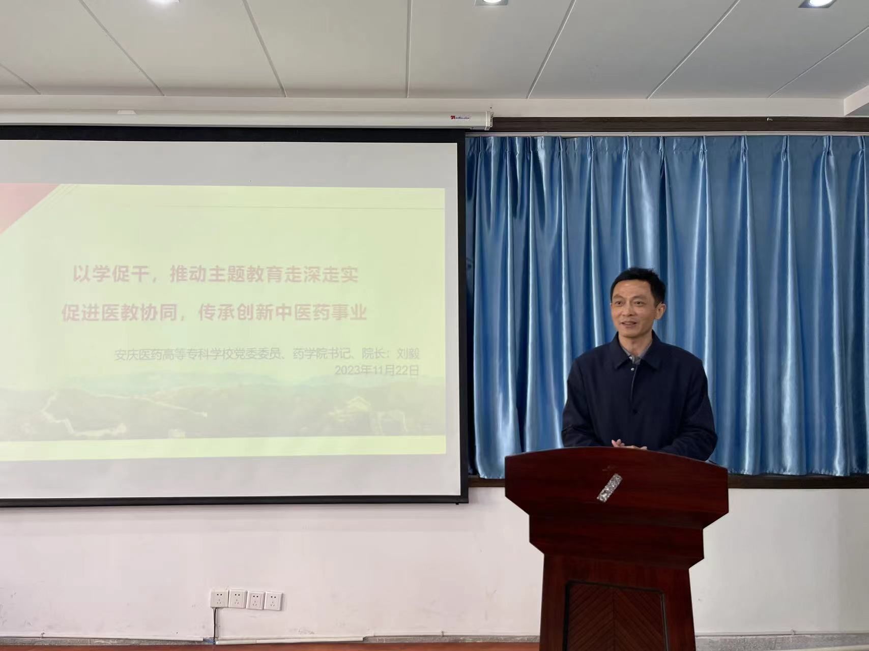 11月22日,校党委委员、药学院书记、院长刘毅以“以学促干,推动主题教育走深走实 促进医教协同,传承创新中医药事业”为题,在医学院外科手术观摩室讲授主题教育专题党课。医学院全体党员同志共同聆听。