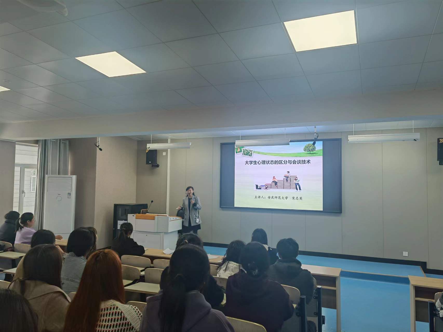 其中,针对2023级心理健康委员进行基础知识培训、针对2022级心理健康委员进行能力提升培训。主要包括:心理委员的工作职责与角色定位、影响大学生心理诱发因素、常见心理问题的症状及识别、心理委员的会谈技巧等。邀请安庆师范大学宋志英教授开展《大学生心理状态的区分与会谈技术》主题讲座,结合具体案例判断正常与异常心理活动,并掌握倾听、共情等心理会谈技巧。