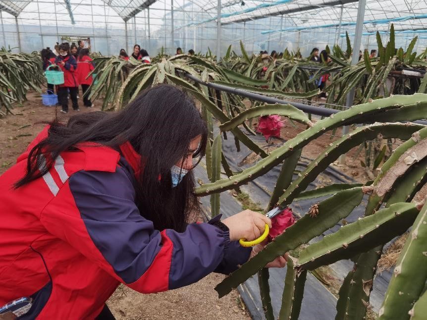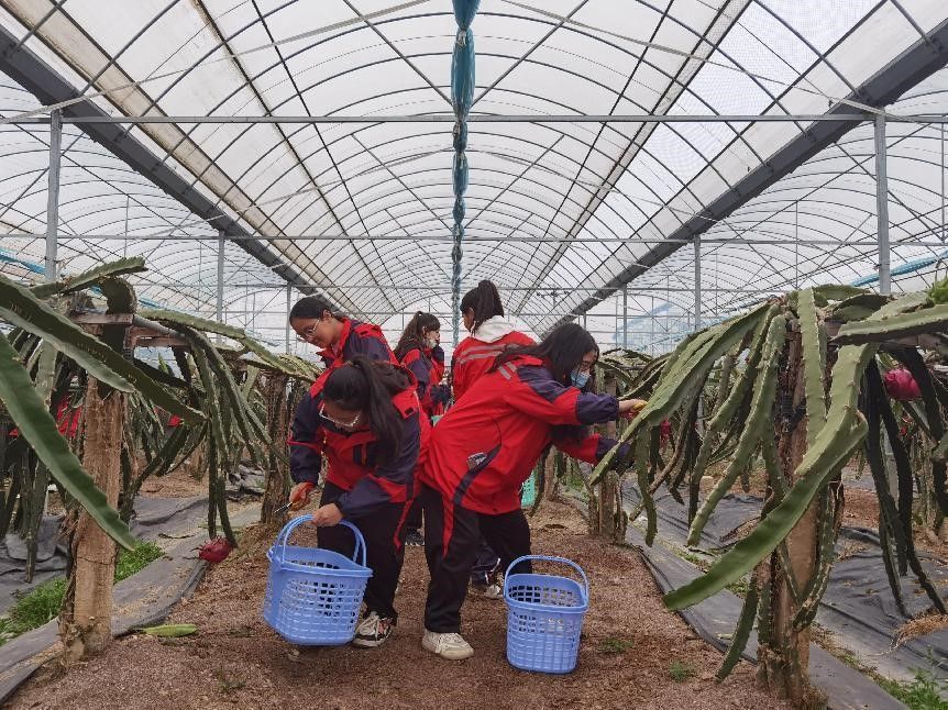 到达目的地,同学们在种植合作社工作人员的陪同下,参观基地,品尝新鲜水果,认真聆听了火龙果的生长过程以及如何修枝和采摘,使同学们更加深入地了解感受到特色农业的科学种植。接着,大家在工作人员的带领下,同学们分组来到火龙果棚区进行采摘,体验亲手采摘的乐趣。