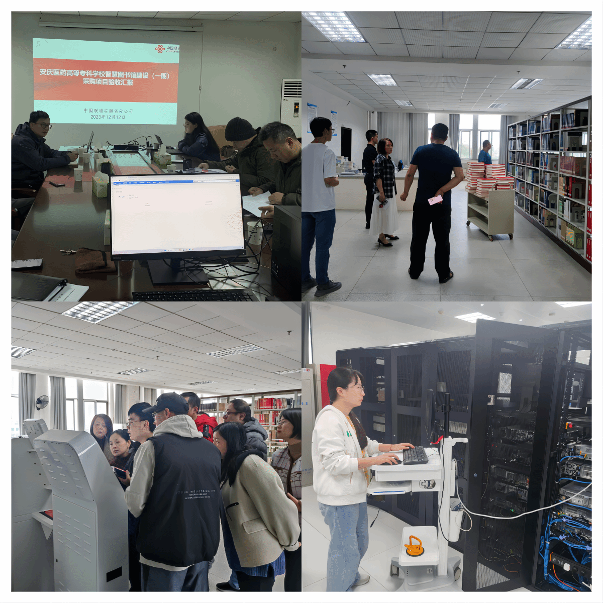 为积极响应国家教育数字化要求,加快我校信息化建设,切实提高我校图书馆的信息化管理水平和信息化服务能力,在校领导及相关部门的大力支持下,校图书馆自2022年底开始筹备“365beat版app智慧图书馆建设(一期)采购项目”,2023年8月底启动项目建设,承建单位为中国联通安徽省分公司。经过90历天的紧张施工和试运行,2023年12月12日,该项目顺利通过校外专家及校内专家组验收,正式投入使用。2023年12月19日上午,校党委副书记、校长朱庆丰,党委委员、纪委书记陈燚,党委委员朱三九、朱雯、刘毅一行,到图书馆查看项目建设情况,并体验自助借还设备,肯定了项目建设的成果并对图书馆工作给予指导。自项目试运行以来,新引进的新一代图书馆服务平台和RFID智能馆藏系统及配套硬件设备也得到了馆员和读者的一致认可,满足了读者对自助借还模式的期盼。