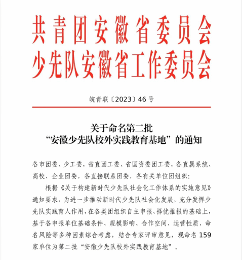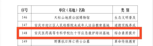 近日,共青团安徽省委、少先队安徽省工作委员会联合发布《关于命名第二批“安徽少先队校外实践教育基地”的通知》,全省159家单位获得命名,其中我校红十字应急救护培训基地成功入选。