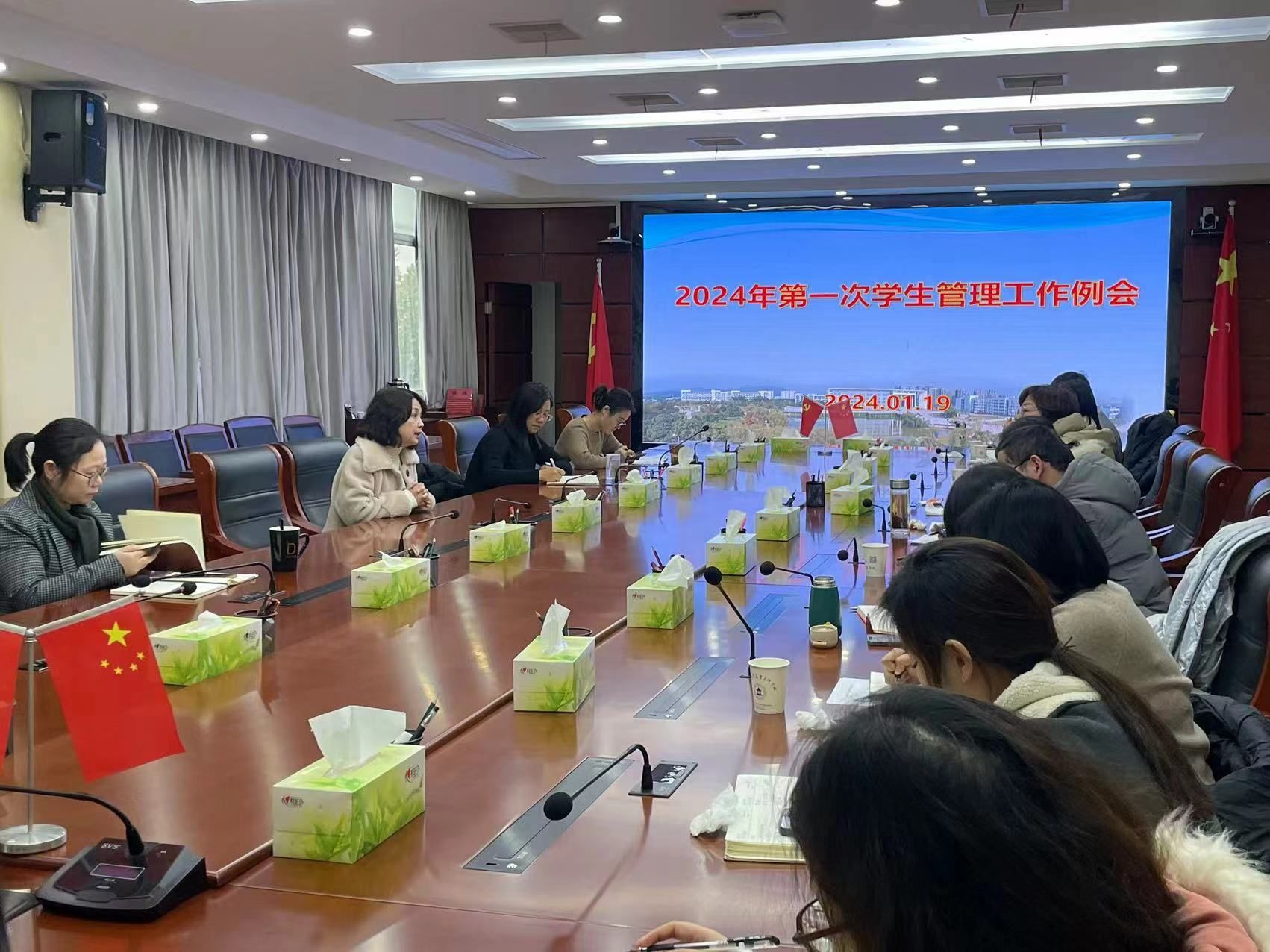 为全面总结2023年学生管理工作,安排部署寒假前后重点工作以及谋划2024年学生管理工作,1月19日,我校在行政三楼大会议室召开了2024年第一次学生管理工作例会,分管校领导陈琪出席会议并讲话,学生处、团委、各二级学院相关负责人和学管干部等参加会议。