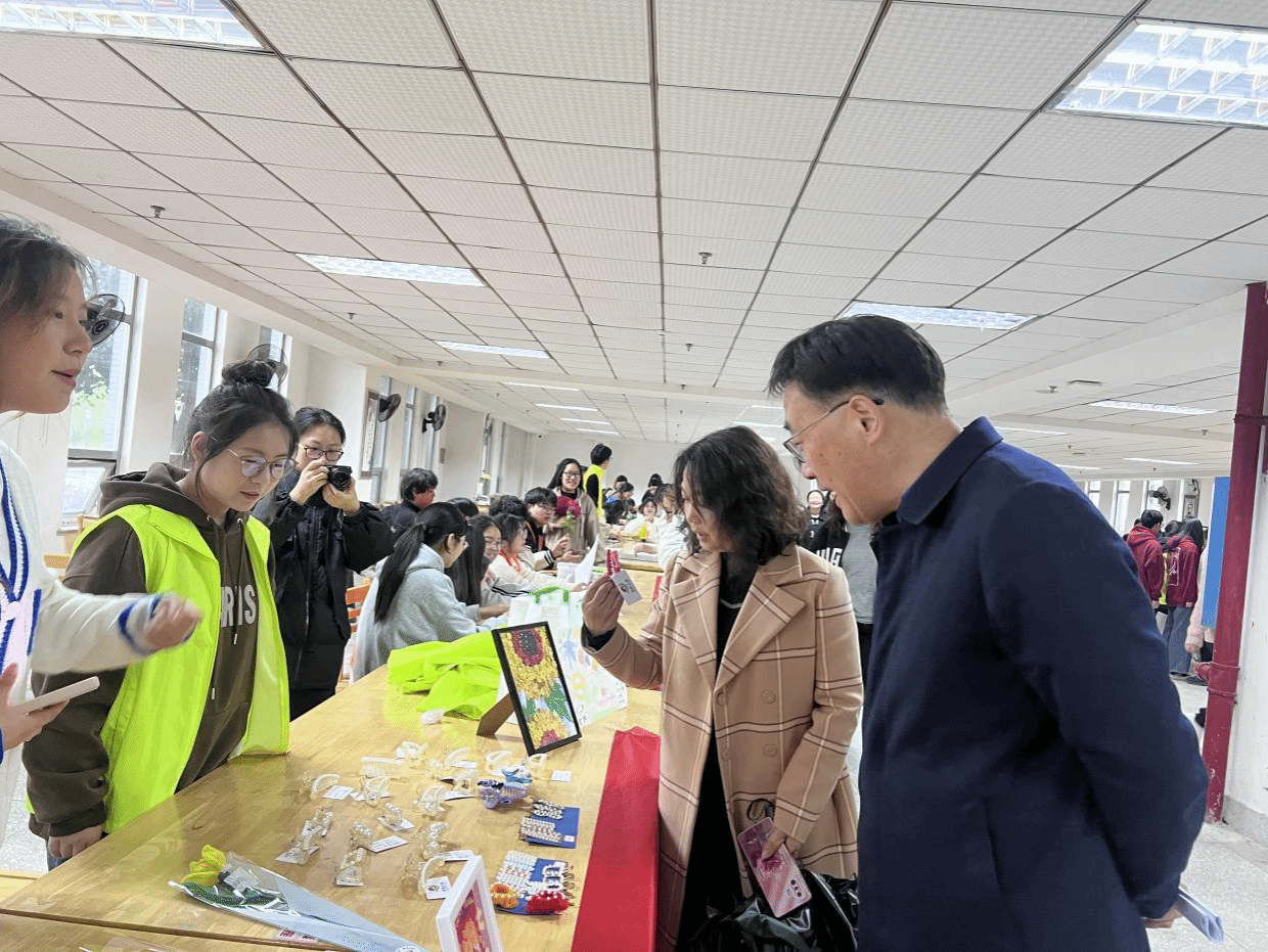 3月27日下午,我校雷锋月志愿服务公益市集在图书馆一楼温暖开市,各学院、学生组织精心组织各类服务摊位,校领导朱庆丰、张仕庆、朱雯、陈琪深入市集,了解学生志愿活动开展情况,图书馆、保卫处也在现场设置志愿服务摊点,为学生提供图书借阅知识、反诈常识等宣传。