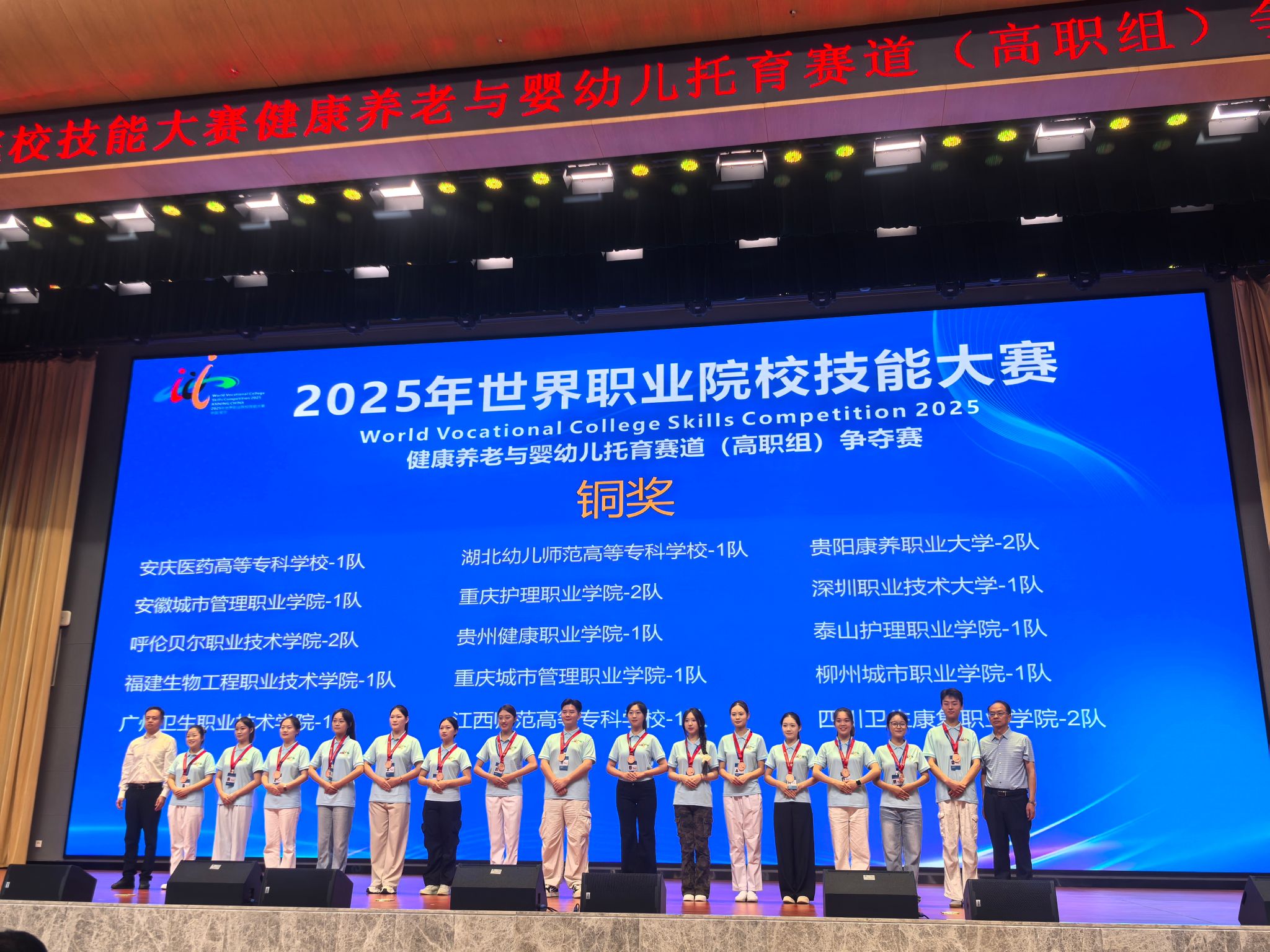 8月29日至9月2日,世界职业院校技能大赛健康养老与婴幼儿托育赛道(高职组)争夺赛,在云南交通运输职业学院举行。我校老年保健与管理专业范皖琴、昝亦泉、耿彩凤、汪豪杰4名学生参赛,同学们凭借扎实的专业技能、出色的临场发挥,最终荣获铜奖。