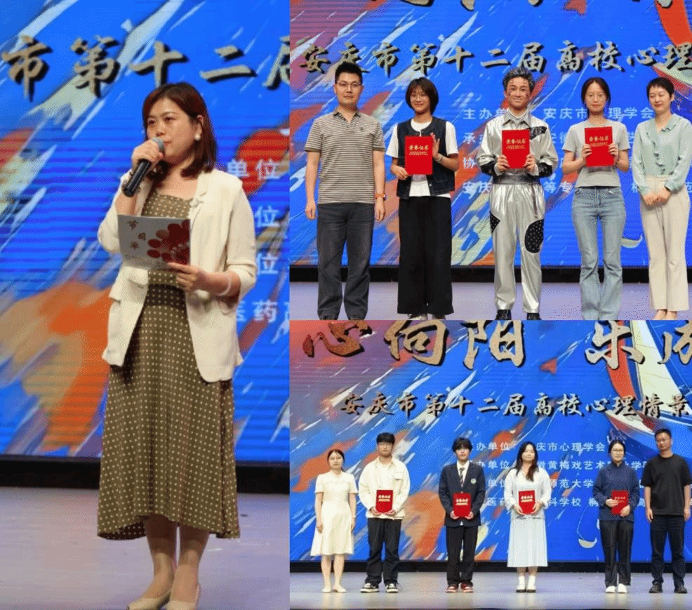 5月28日下午,第十二届安庆市高校心理情景剧大赛在安徽黄梅戏艺术职业学院圆满举办。此次大赛汇聚了安庆市五所高校的优秀剧目,各高校学生以心理情景剧为载体,将大学生常见的心理问题搬上舞台,通过富有感染力的艺术形式,引导学生关注心理健康、科学应对心理困扰。我校选送的心理情景剧《囚于云雀》、《一线光明》分别荣获一等奖和三等奖,我校钱景老师荣获“优秀指导老师”称号。