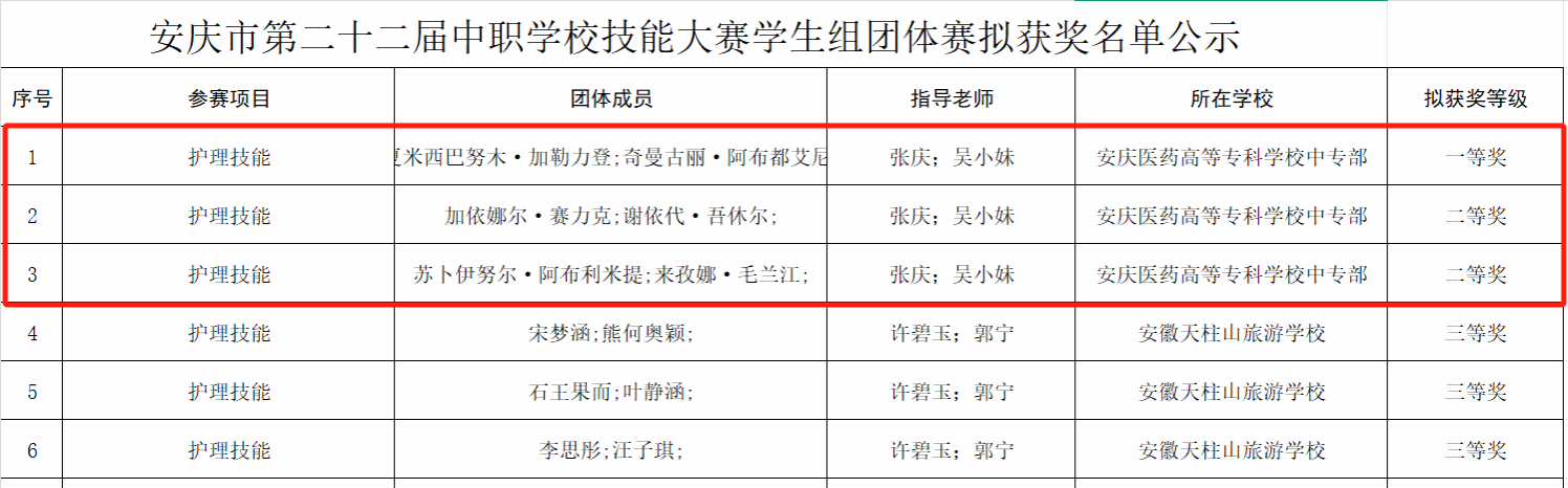2025年5月24日,安庆市第二十二届中等职业院校护理技能大赛在安徽天柱山旅游学校圆满落幕。我校组织护理(中职新疆)学生参赛,以出色的表现包揽比赛一、二等奖,充分展现了我校护理专业的教学实力和学生的综合素质。