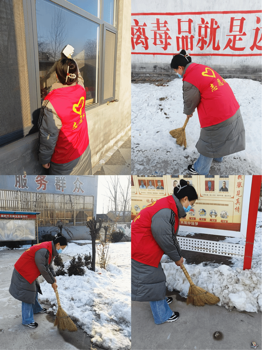 为积极响应乡村振兴“让乡村告别脏乱差”的国家号召,营造和谐美丽社区氛围,2月3日在村委会的召集下,我和十几位青年分布在各自社区积极展开为期三天的清扫活动。我拿起扫帚和清洁工具,和社区人民一起扫雪,打扫环境卫生,对公共设施、街道、住宅窗户等区域都进行了仔细清洁,不放过任何一个角落,在实践队与社区人民的共同努力下,整个社区焕然一新。