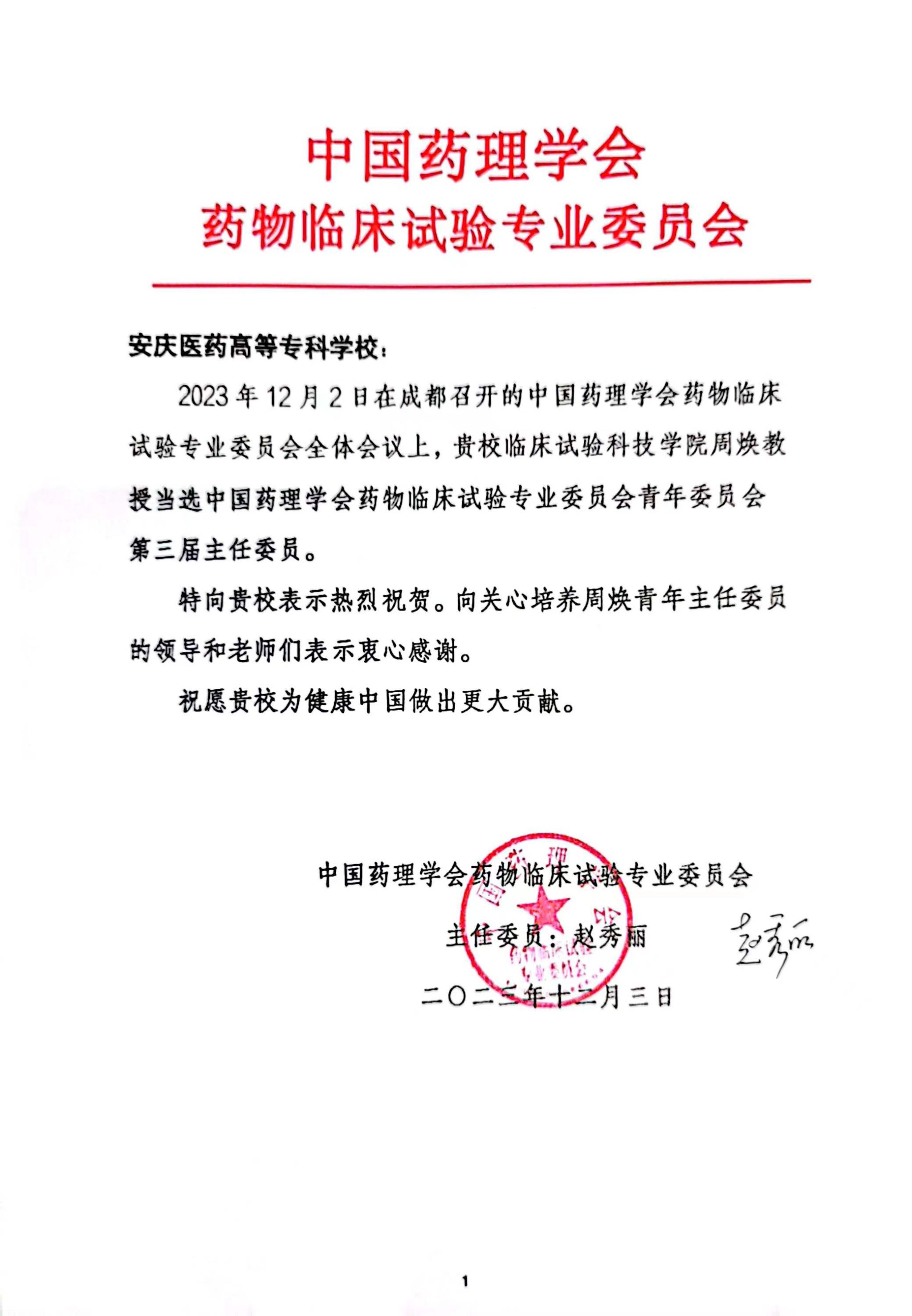 此次周焕教授当选青年主任委员,学院将以此为契机,积极开展工作,为临床试验学科发展、人才培养、药物研发添砖加瓦,培养更多高素质技术技能人才。(撰文、供图:刘婷婷;审改:任丽英、朱金燕)