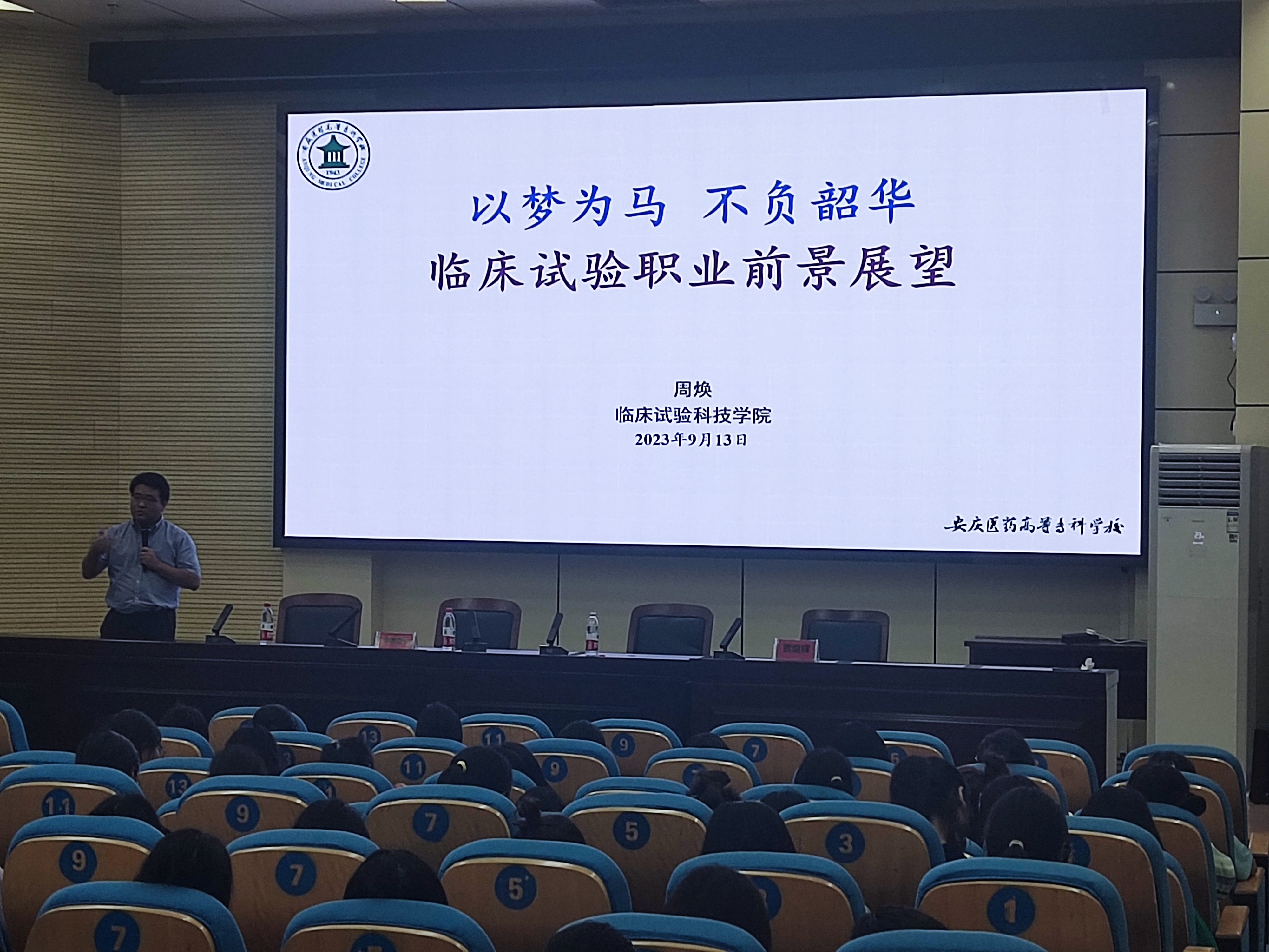 随后,临床试验科技学院院长周焕教授为大家带来讲座“临床试验职业发展”。周院长与学生亲切互动,引导学生思考人生规划与发展路径,并且结合个人经历,以其所带领的蚌医一附院临床试验研究中心各项工作为例介绍临床试验的发展状况、新时代的发展机遇以及临床试验领域的各就业方向。周院长寄期望于在新时代传统临床试验技术转型以及发展机制模式创新的大背景下,创新临床试验人才培养体系,不断提高临床研究质量及成果转化能力。