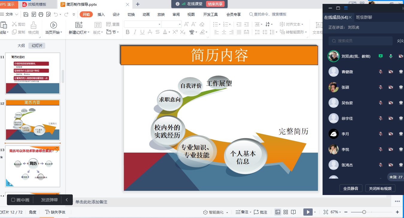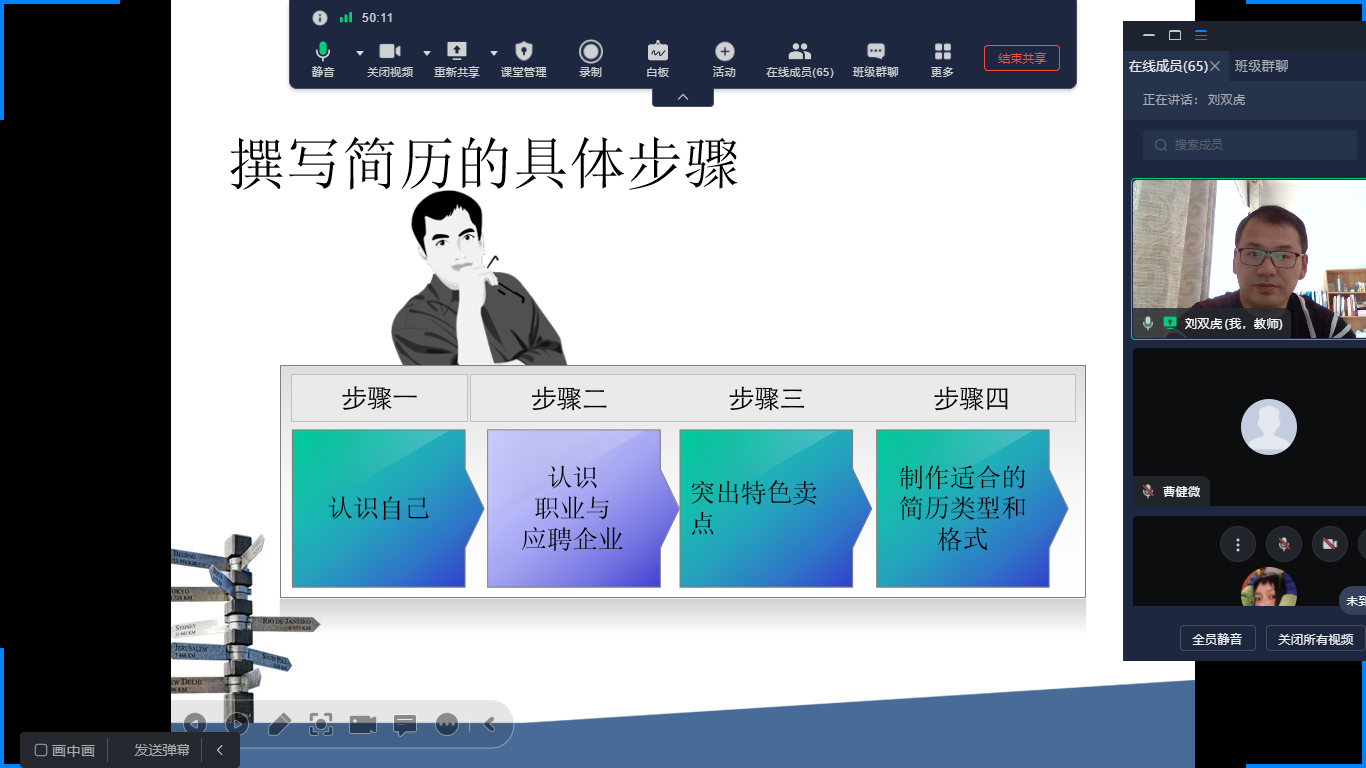 刘双虎老师从好简历的重要性、简历常见的问题以及如何制作一份优秀的简历三个部分展开论述,重点介绍了简历制作中的禁忌事项和好简历的四要素、三原则。最后刘双虎老师就同学们提出的简历制作问题和就业相关问题进行线上交流和解答。