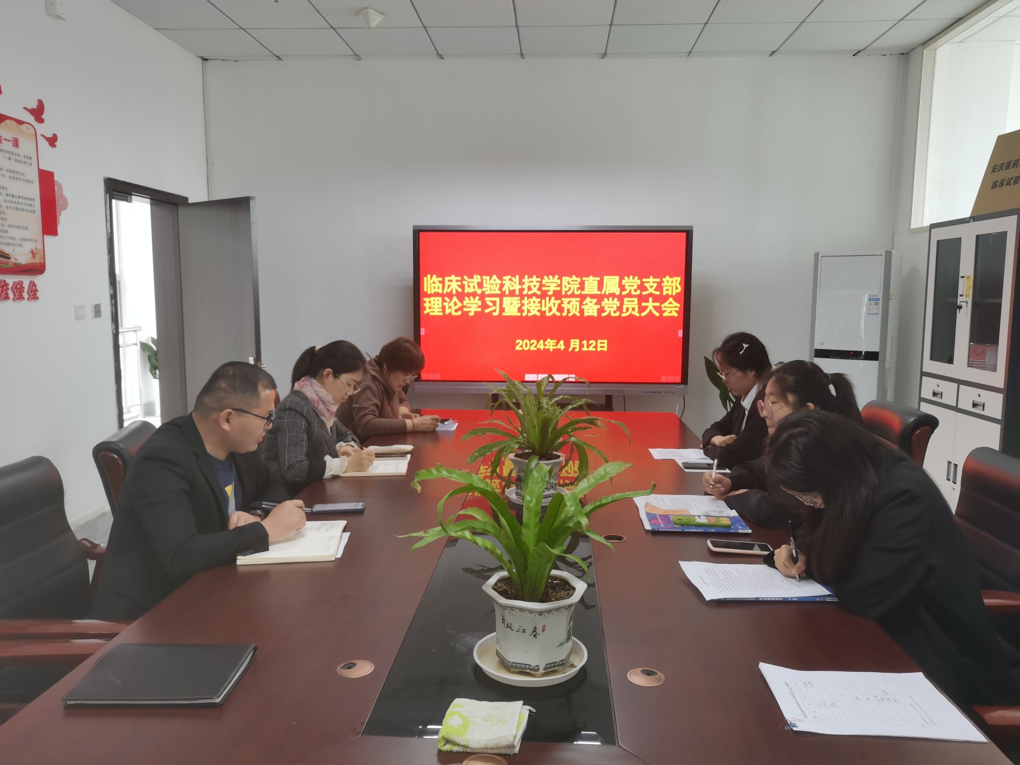 2024年4月12日,临床试验科技学院直属党支部在学院会议室召开政治理论学习暨接收预备党员大会,会议由学院党支部副书记任丽英主持,全体党员和三名发展对象参加大会。