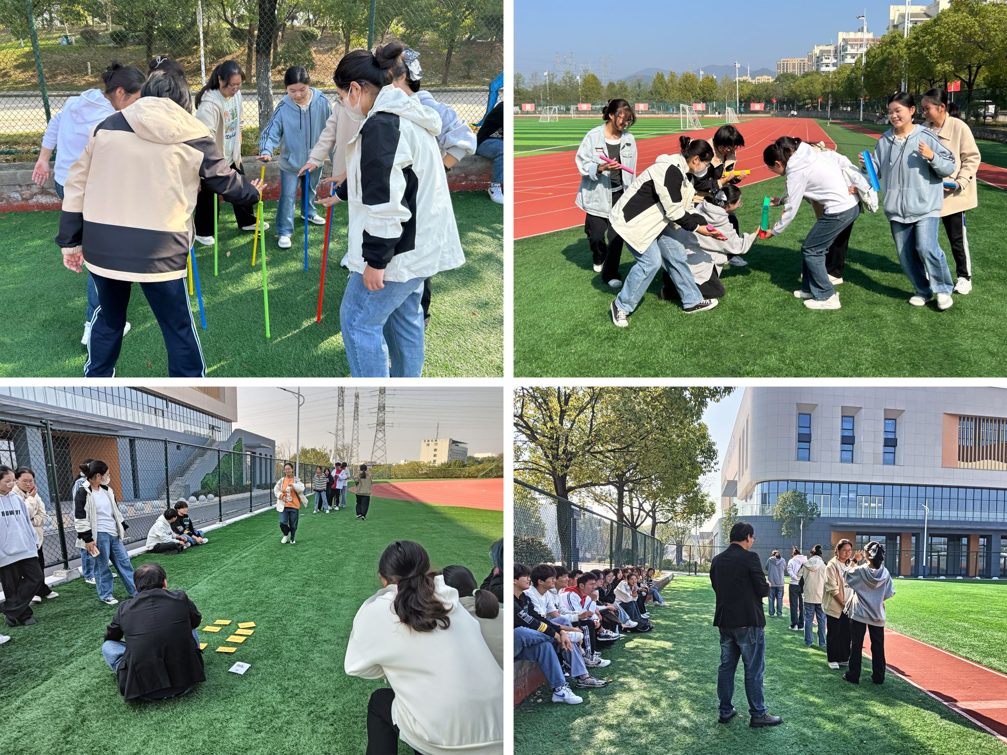 上午9点,阳光明媚,晴空万里,大家在学校风雨操场集合。本次团建活动由破冰行动、团结友爱、合作共赢三个部分组成。首先进行的是破冰行动,同学们通过“快乐一块五”的游戏迅速组队成功。为加强团队成员的熟悉程度,各团队进行人名接龙环节,通过人名接龙让同学们之间进一步认识,也消除了组建班级以来的陌生感。紧接着进入正式的游戏环节—“不倒森林”,“不倒森林”要求每个团队成员手拿一根1.2m的塑料杆围成一个圆,用右手掌心抵住塑料杆一头,将塑料杆立在地上,在塑料杆不倒的情况下迅速向前移动,并用手抵住前面同学的塑料杆,在交接中杆子不能落地,如果落地就必须重新开始。每个人转了三圈后再次回到原位,游戏才算过关。“不倒森林”这个游戏是本次团建最难的活动,非常考验同学们之间的团结合作,但凡有一个人没有保持团队节奏整个游戏就失败了。三个团队经过反复练习,最终都圆满完成了比赛任务,喜悦之情溢于言表。接着进行的是游戏“珠行万里”,考验的则是团队的反应能力、团结合作和沟通协调能力。比赛中,同学们用一个个小竹筒接力传珠,迅速细致,奋勇争先,展现了班级团结友爱,积极进取的精神面貌。