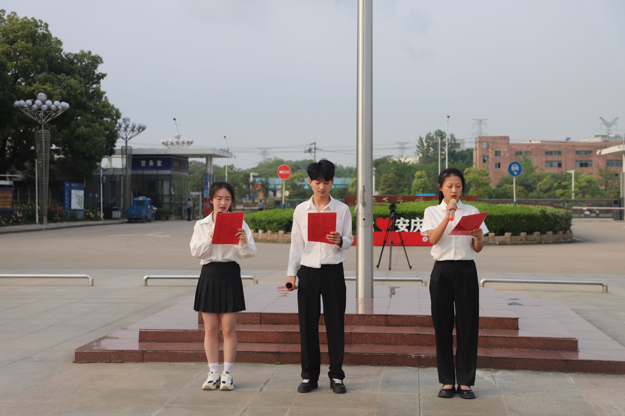 上午七时整,升旗仪式在雄浑激昂的国歌声中拉开帷幕。国旗护卫队队员朝气蓬勃、意气风发,踏着整齐有力的步伐迈向升旗台。国歌奏响,全场肃立,在庄严肃穆的旋律中,鲜艳的五星红旗徐徐升起,全体师生神情庄重,满怀对伟大祖国的热爱与敬意,面向五星红旗行注目礼。