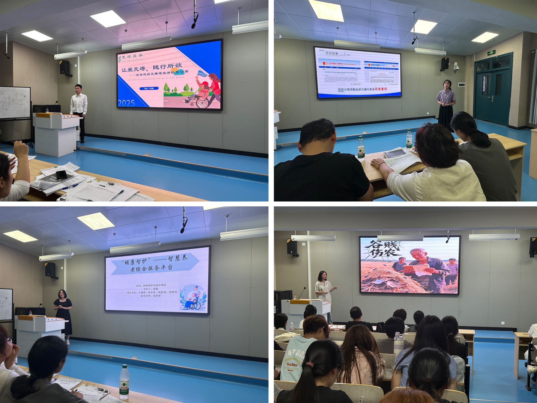 本次院赛共计12个项目参与现场决赛,项目涵盖临床试验、健康养老、传统文化及无障碍服务等多个领域。在展示环节,同学们自信满满地介绍自己的项目,从社会需求、项目优势到最新成果,每一个细节都精心打磨。路演现场气氛热烈,各团队代表通过PPT等方式展示,生动地阐述项目亮点与社会价值。面对评委的提问,选手们思维敏捷、对答如流,展现出扎实的专业知识和良好的应变能力。